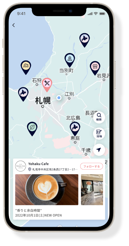 北海道の街めぐりや、お店・施設などの紹介などをリアルタイムで共有することができます。