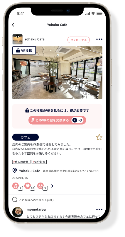 VRで撮った動画も投稿することができます。VR動画を再生するにはポイントが必要ですが、ポイントはフォローしたり、お友だち・お店にまっぽろを紹介するだけですぐに貯まっていきます。